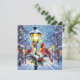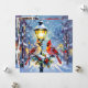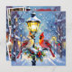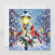 A beautiful Christmas card with an impasto style ai illustration of a female and male cardinal sitting on a lamppost on a snowy winter night. A back drop of a cute festive street and village. On the back of the card you can add your own custom message and three family photos in the personalize area.
