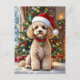 An adorable Christmas postcard with a festive poodle sitting in front of the fireplace on a cold winter day. A Christmas tree decorated and a festive background. Add your own custom message.