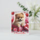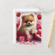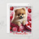 This Valentine's Day postcard showcases a charming Pomeranian dog nestled in a gift box adorned with red hearts and pink roses. A festive greeting is featured on the reverse side of the card. This delightful dog-themed card is sure to be cherished by all canine enthusiasts.