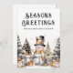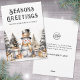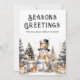 Envoyez vos vœux chaleureux à vos clients, partenaires ou employés avec cette charmante carte de Noël d'entreprise mettant en vedette un design de bonhomme de neige aquarelle festif. Le recto présente un délicieux bonhomme de neige noir et blanc portant un chapeau haut-de-forme et une écharpe dorée, entouré d'accents dorés, d'arbres de fête et de cadeaux, apportant une atmosphère hivernale fantaisiste et cosy.