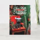 Ce petit chien d'Affenpinscher est sympa avec un soupçon de coquine et s'assoit avec un chapeau de Père Noël sur une chaise rouge entourée d'un décor de vacances sur ce joli salut de Noël.