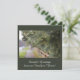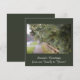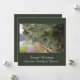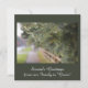 L'œuvre d'art est une photographie de branches d'arbres persistants s'étendant au-dessus d'une clôture en bois le long d'un chemin piétonnier, avec des gouttes de pluie sur les aiguilles de pin créant un effet scintillant lumineux et joyeux, ainsi qu'un champ de typographie personnalisable qui indique actuellement "Meilleurs vœux de notre famille à la vôtre !!" pour un souhait ou une personnalisation. La photographie de paysage a été prise dans l'Illinois, aux États-Unis d'Amérique.