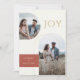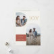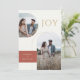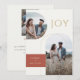 Ces cartes de vœux plates de 5" x 7" comportent des espaces réservés pour trois photos, deux noms, l'année et un message. Le recto présente deux photos en arc, une verticale et une horizontale. Le message de vœux est "Joie," en lettres dorées. Le fond est ivoire avec un encadré de couleur brique adobe rouge entourant les noms du couple. Le verso comporte une photo verticale. Le message personnalisable indique : "Nous sommes ravis d'annoncer que nous sommes fiancés, et nous vous souhaitons à tous deux paix et joie pendant les fêtes et dans l'année à venir."