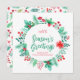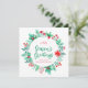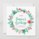 Cette conception comprend une couronne circulaire remplie de plantes de Noël à l'aquarelle peinte à la main, telles que le houx, le pin, les baies et les fleurs rouges. Sur le dos se trouve un motif avec les mêmes éléments. Il s'agit d'une carte de Noël de style traditionnel avec une palette de couleurs de rouge et de vert. Vous pouvez customiser tout le texte. Voir toute la collection correspondante !