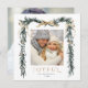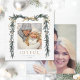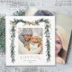 Cette élégante carte de carré de vacances photo présente un cadre de branche de pin aquarelle (bordure) orné de rubans d'or, de baies sèches et de verdure botanique, ainsi qu'une photo supplémentaire à l'arrière. Envoyez la joie de Noël à votre famille et à vos amis.