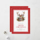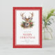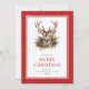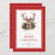 Aquarelle rouge Joyeuse carte de Noël avec une aquarelle illustration d'un cerf entouré de décoration de Noël de saints, de pins et d'ornements de Noël. Personnalisez facilement cette carte de vacances en couleur rouge avec votre nom de famille et votre texte.