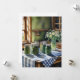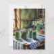 La lumière du soleil coule à travers de grandes fenêtres de cuisine, illuminant des jarres remplies de légumes verts et un vase de marguerites sur une table drapée d'un tissu à damiers bleu et blanc. Cabine en bois et mur vert créent une atmosphère rustique et cosy dans la cuisine.