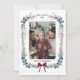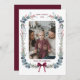 Célébrez la saison avec cette carte de Noël botanique Bow Bow Watercolor Green Botanical Photo Holiday Card. Doté d'un cadre botanique charmant d'eucalyptus et d'accents saints, jumelé à un arc bordeaux sophistiqué, cette carte présente magnifiquement votre photo de famille préférée. Parfait pour envoyer des souhaits chaleureux à des proches, cette carte personnalisée allie élégance intemporelle et joie festive.