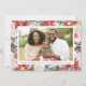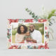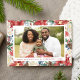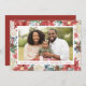 Envoyez des salutations festives avec ce carte photo de vacances rustique avec votre photo préférée encadrée en blanc et entourée de poinsettias aquarelle, fleurs blanches, baies sèches et pinecones. Personnalisez avec votre salutation, votre nom de famille et votre année. L'envers dispose d'un arrière - plan rouge rouille solide avec espace pour le texte ou les images supplémentaires. Un design de Noël intemporel au charme floral vintage.