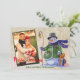 Un amusant tableau aquarelle d'un bonhomme de neige de Noël heureux déclenche votre photo encadrée verticale. Vos noms en bas. Le graphique Joyeux Noël et être déplacé et redimensionné selon les besoins.