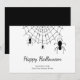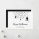 Carte de vœux simple noir et blanc pour les vacances, avec un design d'araignées gothiques et des lettres de typographie personnalisables en noir. Idéal pour envoyer des vœux effrayants à Halloween.