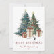 Cette élégante carte de vacances d'arbre de Noël présente deux arbres de Noël ornés de décorations en verre et entourés de cadeaux emballés. Personnalisez la carte en ajoutant vos vœux de Noël, le nom de votre famille et l'année.
