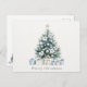 Carte postale de Noël avec une aquarelle illustrant un sapin de Noël dans les tons bleu vert décoré d'ornements bleus et de fleurs blanches de poinsettia avec des cadeaux de Noël élégamment emballés dans les tons bleu et neutre ci-dessous. Joyeux voeux de Noël centré ci-dessous illustration et arrière - plan fausse texture sur le devant. Illustration de sapin de Noël répétée à l'envers.