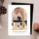 Carte photo de vacances moderne avec 3 de vos photos disposées dans une grille en arc. Personnalisez l'avant de la carte de vacances multi-photo avec votre salutation personnalisée et votre nom de famille affiché en lettres noires. La carte revient à un subtil motif à points noirs et blancs.