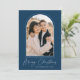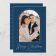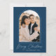 Carte de Noël moderne avec votre photo verticale encadrée par un arc pointillé avec un arrière - plan bleu foncé (ou couleur de votre choix). "Joyeux Noël" s'affiche en écriture de script blanc tendance. Personnalisez le recto de la carte en ajoutant le nom de votre famille et l'année. La carte inverse pour afficher un motif de ligne pointillée blanche.
