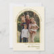 Elégant Arc Or 5 Photo Noël Joyeux Noël Carte de Noël. Célébrez la saison avec élégance grâce à cette carte de Noël familiale et élégante, dotée d'un cadre photo moderne en arc de cercle couleur or. Personnalisez-le avec vos photos de famille préférées, le nom de famille, et l'année sur arrière - plan beige neutre blanc ou crème. Le design minimaliste festif est mis en valeur par une élégante typographie Happy Holidays couleur faux or, créant un look chaleureux et intemporel. Le dos montre 4 collage photo avec bordure dorée et modèle de messages de vacances avec des noms de lettres à la main. Une carte de vacances parfaite à partager en famille et entre amis en hiver.