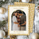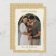 Retro Gold Plaid et Arch Photo Christmas Happy Holiday Card. Célébrez la saison avec élégance grâce à cette carte de Noël en plastique avec une bordure en vichy en faux or et un cadre photo moderne en forme d'arc. Personnalisez-le avec votre photo de famille préférée, avec des textes modèles "Joyeux Vacances", nom de famille, et l'année sur arrière - plan beige blanc ou crème. Le design festif est mis en valeur par une élégante typographie Happy Holidays couleur faux or, créant un look chaleureux et intemporel. Le dos présente un motif en vichy jaune doré assorti pour une finition coordonnée et polie. Une carte de vacances parfaite à partager en famille et entre amis en hiver.