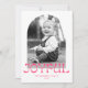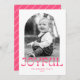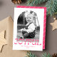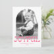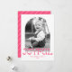 Joli carte photo de vacances avec votre photo verticale à l'intérieur d'une arche blanche. "Joyful" s'affiche dans des lettres amusantes et roses rétro avec votre nom et l'année ci-dessous. La carte de Noël rétro s'inverse pour afficher un motif à rayures en diagonale rose et blanc.