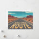 This bold graphic illustration captures the iconic feel of an endless Arizona road cutting through a vast desert landscape. Cracked yellow road lettering, dramatic red rock formations, and a striking turquoise sky create a powerful sense of solitude, freedom, and adventure. The symmetrical composition and stylized details draw the eye forward, evoking classic American road trips, Southwest travel culture, and the spirit of open highways.