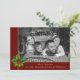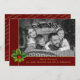 Votre photo en couleur sera automatiquement convertie en une image en noir et blanc élégant lors de son téléchargement dans cette conception moderne de carte photo de Noël propre. Votre photo de famille remplissant le visage de la carte derrière un cadre rouge et or surligné d'une pince de pin et de houx. Le groupe de bas tient vos noms et voeux de Noël dans une police d'or. Joyeux motif de Noël en or brillant sur le dos contre un rouge de Noël foncé.
