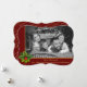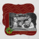 Votre photo en couleur sera automatiquement convertie en une image en noir et blanc élégant lors de son téléchargement dans cette conception moderne de carte photo de Noël propre. Votre photo de famille remplissant le visage de la carte derrière un cadre rouge et or surligné d'une pince de pin et de houx. Le groupe de bas tient vos noms et voeux de Noël dans une police d'or. Joyeux motif de Noël en or brillant sur le dos contre un rouge de Noël foncé.