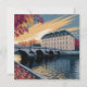 This stylized illustration captures a serene European riverside scene framed by warm autumn foliage and classic architecture. The balanced composition highlights a grand riverside building, an elegant stone bridge, and rich reflections across calm water. With a refined poster-style aesthetic, simplified shapes, and a striking seasonal color palette, this artwork delivers a timeless, atmospheric mood perfect for lovers of travel-inspired cityscapes, architecture, and fall-themed visual storytelling.