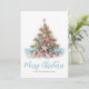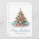 Celebrate the holidays with a bit of surf and sand with this shell and starfish Christmas Tree holiday card. Wish your loved ones a happy holiday season in beachy style. Whether you live in a beach or tropical location like Florida, California, Bahamas, or just love the beach look, this print is for you! This Christmas Tree has a starfish star up top and is covered in a mix of seashells and starfish. At the base is sand and some teal blue ocean waves. This print has a rustic or distressed watercolor look. A mix of simple fonts and script typography gives it a casual but elegant style.
