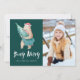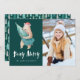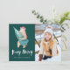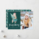 Souhaitez à vos amis et à votre famille un Beary Joyeux Noël avec nos cartes photos de vacances de Beary Joyeux! Les mignons cartes de fin de année ont un ours brun portant un chapeau de Père Noël et portant un arbre de Noël dans sa tanière. Les mots "Beary Merry" sont présentés ci-dessous dans une police de caractères blanche et manuscrite contre un arrière - plan vert de forêt. Personnalisez en ajoutant votre photo préférée et vos noms. Le revers de la carte présente un motif de Noël mignon dans différentes nuances de vert et de turquoise.
