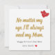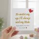 Show your mom how much she means to you with this heartfelt Mother’s Day card featuring the touching quote: “No matter my age, I’ll always need my Mum.” A simple yet emotional design with elegant gold lettering and sweet heart accents makes this card a beautiful way to express love and gratitude.