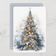 La carte de vœux de Noël comporte un bel arbre de Noël bleu-gris qui a des saupoudres de neige, des lumières d'étoiles scintillantes et des ornements dorés élégants et scintillants.