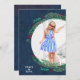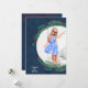 Une couronne de branches de pin, de baies et de feuilles sur un arrière - plan bleu foncé entoure votre photo préférée avec votre salutation en lettres chic sur le devant et votre message et personnalisation sur le dos. Sélectionnez Matte pour le papier le plus lourd et la haute définition pour une meilleure qualité d'impression.
