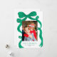 This modern yet festive holiday photo card features a large hand-drawn bow in green over a simple white background. There is one vertical photo and an editable greeting. The back of the card is blank but you could easily add another photo and/or additional text. The background, greeting, and text colors are customizable.
