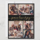 Minimaliste moderne Black and Gold 5 Photo Collage "Paix, Amour et Joie" Carte de Noël. Cette carte de vacances élégante comporte un collage de 5 photos sur le devant et une photo supplémentaire sur le dos. Le message "Paix, Amour et Joie" est magnifiquement écrit à la main en calligraphie or (fausse) sur un arrière - plan noir élégant, ajoutant une touche de sophistication à vos salutations de vacances. Le côté arrière comprend un modèle de salutation personnalisable avec un motif de doodle cardiaque et un espace pour une photo de plus. Parfait pour partager des souvenirs de vacances en famille et entre amis, cette carte personnalisée apporte une joie festive à la saison de Noël.