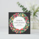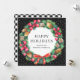 Carte de vacances professionnelle personnalisée en noir et blanc en vichy plaid comportant une couronne d'aquarelle de Noël de branches, cônes et rubans rouges. Personnalisez facilement cette carte noire de vacances d'affaires avec votre nom d'entreprise.