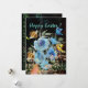 Trouvez cette jolie carte de vacances de Pâques avec des roses et des fleurs bleues sur un fond noir avec des nuances de rose et de vert.