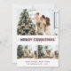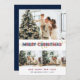 Personnalisé bleu et rouge Joyeux cartes photos de Noël avec un collage photo avec un titre décoratif et des lumières de Noël sur le devant et bleu foncé arrière - plan avec la neige tombée à l'arrière. Personnalisez facilement ces cartes photos de Noël rouges et bleues avec vos images, un nom de famille et l'année.