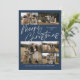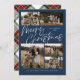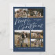 Blue Merry Christmas Calligraphy Script 5 Photo Holiday Card propose un script de calligraphie moderne sur le devant, avec trois photos, et un plaid de Noël festif sur le dos.
