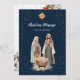 Beautiful blue Christian Christmas card featuring a scene with Mary, Joseph and the infant Jesus Christ in the manger in Bethlehem on the front and a watercolor painting of poinsettia, holly and red berries at the back.