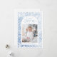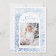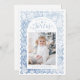 Whimsical joyful holiday card features hand drawn festive Christmas celebration illustrations in watercolor winter blue color, with personalized family photo, modern and fun.