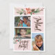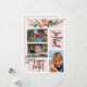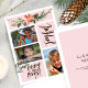 Carte de vacances moderne rose vif 3 photo collage avec un bouquet saisonnier d'aquarelle de Noël avec une fleur en terre cuite rouge poinsettia, une pinecone, des boughs verts de chasseur de sauge, des baies rouges et du feuillage avec "Joyeux" "Joyeux et brillant" calligraphie à la mode écriture lettrée à la main. +++++++++++ Personnalisez-le avec trois de vos photos sur le côté avant et votre signature au verso !