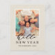 Envoyez vos vœux de fêtes à votre famille et à vos amis. La carte postale photo du Nouvel An comporte un script Bonjour Nouvel An sur un fond de texture de toile de jute faux.