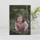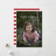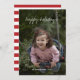 Bonnes fêtes cartes photos personnalisables de vacances (bilatéraux) comportant les mots "bonnes fêtes", dans la calligraphie blanche/manuscrit comme le modèle des textes, contre un modèle d'image de fille mignonne. Le dos de ces bonnes fêtes cartes photos simples et modernes de Noël (5x7 plat) comportent des rayures horizontales rouges et blanches de fête/motif rayé.