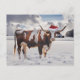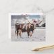 Country western carte postale de Noël mignonne avec une jolie lounghorn dans la neige avec un chapeau de Père Noël. Une jolie carte postale de Noël à la campagne.