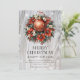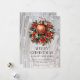 Botanical holiday card featuring a Christmas ornament and beautiful foliage against a rustic wood background decorated with snowflakes. Easily personalize this holiday card with your family name and text.