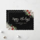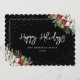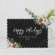 Carte Black Happy Holidays ornée d'un cadre de neige orné de poinsettia blancs, sainte aux baies rouges et autres verdure. Personnalisez facilement cette carte de vacances élégante avec votre texte.