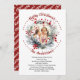 Cette carte de Noël présente une couronne de branches ornée de baies rouges et une photo de famille. Le message de bienvenue "Joyeux Noël" arche au-dessus de l'image, tandis que le nom de famille est élégamment affiché ci-dessous dans un script fluide, flanqué de points rouges. Un message personnel à l'encre noire transmet des voeux chaleureux au destinataire sous la photo. Au verso, un riche arrière - plan rouge, avec un motif fait de l'expression "Joyeux Noël" en blanc, positionné en diagonale.