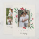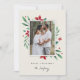 Elégant et festif carte photo de vacances encadre votre image préférée verticale ou portrait orienté avec une subtile bordure de pont et feuillage rouge et vert de vacances en regardant aux coins. "Joyeux Noël" ou votre choix de salutation apparaît en dessous, avec votre nom de famille, sur un arrière - plan en ivoire mou. Ajoutez trois photos supplémentaires à l'arrière, ainsi qu'un message personnel.