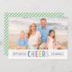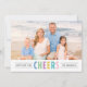 Un carte photo de vacances simple et moderne présente votre photo avec un texte multicolore "Cheers" et un texte personnalisé pour un message saisonnier, votre nom de famille, et année. Le dos de la carte comprend un motif de bandes diagonales. Les couleurs gaies, parfaites pour une photo été / vacances, comprennent bleu ciel, vert menthe, violet violet, jaune doré, turquoise / bleu turquoise, et rose clair.
