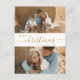 Moderne, minimaliste, élégant "Joyeux Noël" Script 2 Photo Collage de Noël Carte postale de Noël en or et blanc. Ce modèle festif, clair minimaliste, deux (2) cartes de vacances familiales avec photo présente un joli montage photo en grille et dit "Joyeux Noël"! Le script de texte de salutation "Noël" est écrit dans un texte écrit à la main tourbillonnant swash tail type police. A l'arrière, une photo et votre message. Jolie carte de voeux pour votre famille et vos amis en hiver.