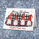 Cette page de cette carte de voeux de vacances comporte quatre petits gnomes à barbe blanche qui vous apportent des salutations saisonnières. Chacun des gnomes est habillé d'un motif rouge et blanc différent sur ses grands chapeaux de Père Noël. Les images sont placées sur un arrière - plan de balançoire à buffle noir et blanc. Des flocons de neige éparpillés dérivent autour d'eux Le texte du script "Joyeux Noël" est en blanc au-dessus d'eux, et "Bonne année" est ci-dessous. Le texte rouge et vert intérieur peut être customisé par vous.